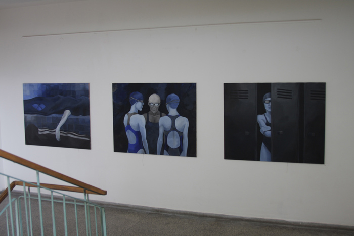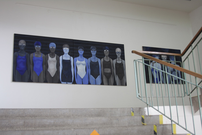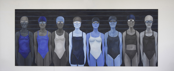Nejprve jako plavkyně nastoupené v řadě, kdy jednotlivé figury ztrácejí až na obličeje, odlišností a stávají se spíše vyděšenými, znechucenými pěšáky bez možnosti vlastního názoru a rozhodování o sobě samém. Opačným typem plavkyň, znázorněným v malířské sérii, jsou tři ženy shluknuté k sobě se značně nadsazenou muskulaturu. Svou tělesností a výrazy v obličejích připomínají spíše muže. Oproti plavkyním v řadě vyvolávají tři ženy úplně opačné dojmy, působí spíše agresivně a nepřátelsky. Nejsou utlačovány systémem stejně jako plavkyně v řadě, ale zdají se být vykonavateli vůle systému.