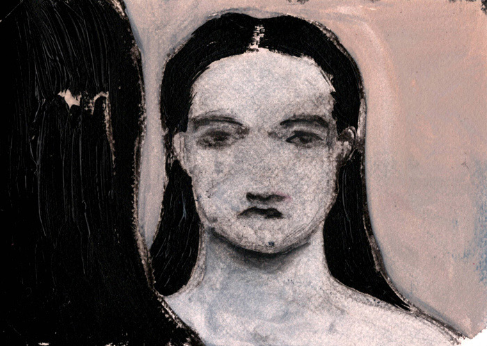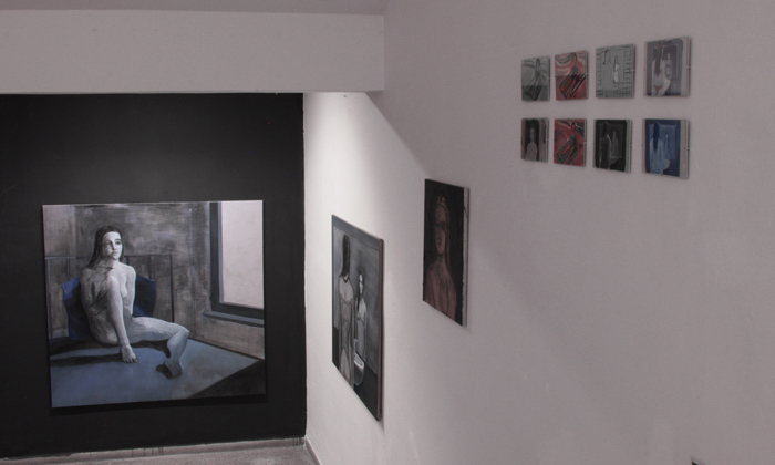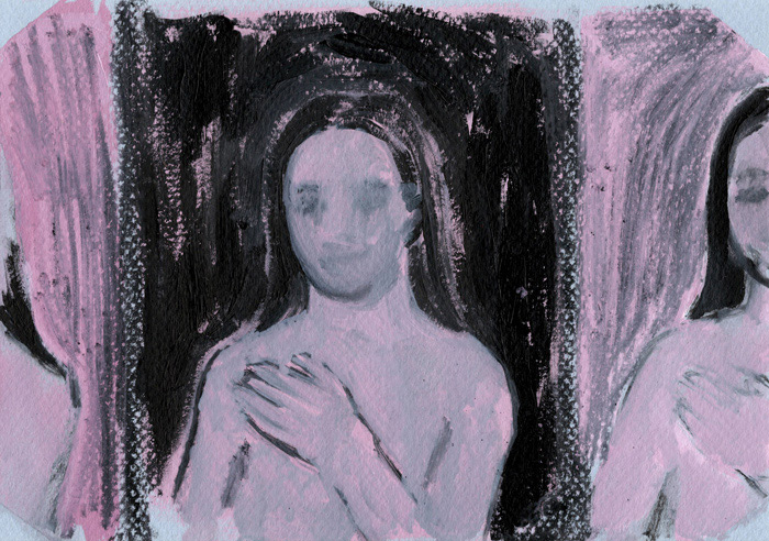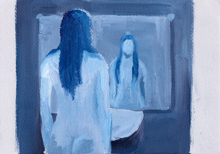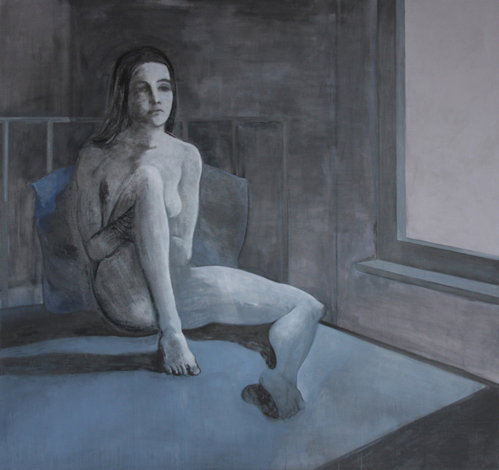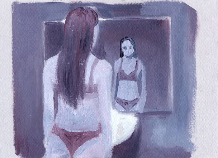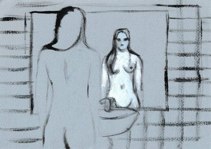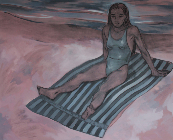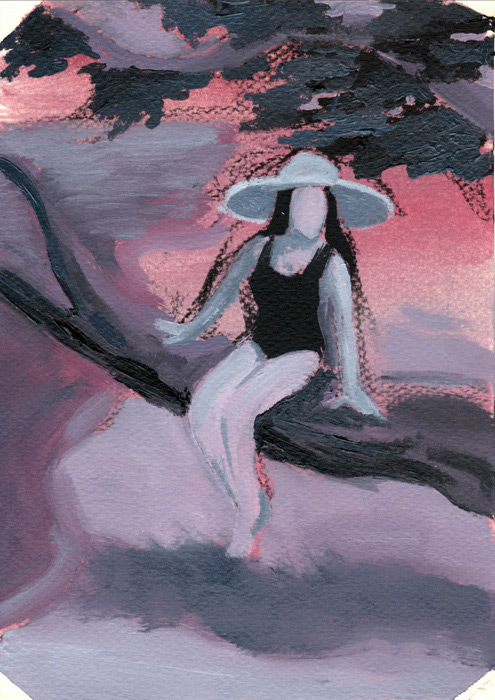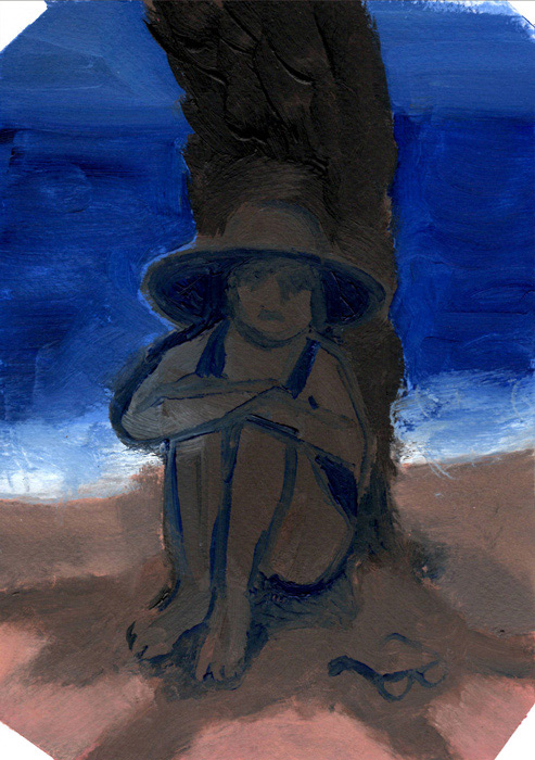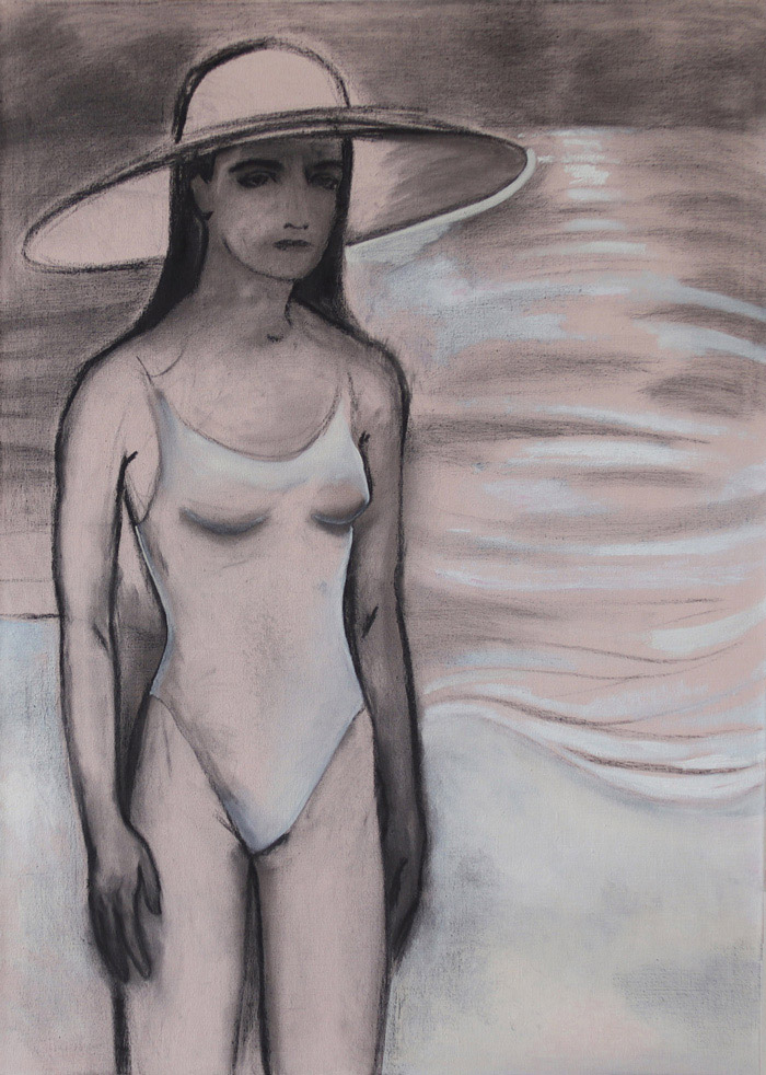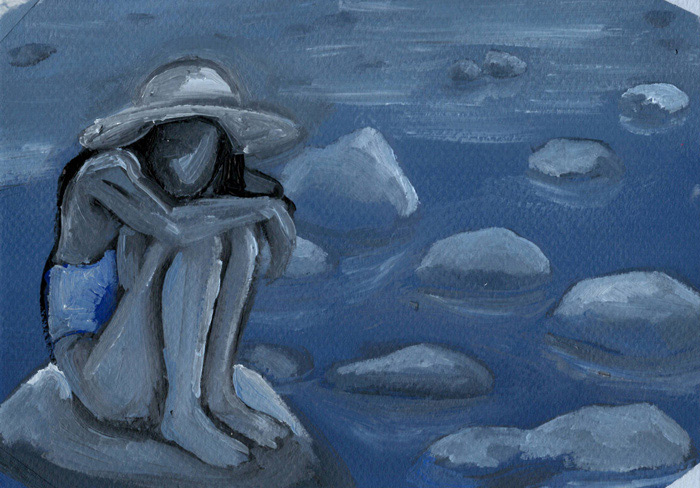 V malbách jsem se rozhodla zachytit osamocenou ženskou figuru, která má v daném prostředí ztvárňovat moje pocity osamění, být ztělesněním samoty, ale zároveň není mnou a ani nezachycuje žádnou konkrétní událost nebo mou vzpomínku. Prostředí jsem volila podle toho, kde si myslím, že na člověka může nejvíce dopadat samota. Osamocenost na dovolené – na pláži u moře, dále prostředí koupelny a ložnice v noci.