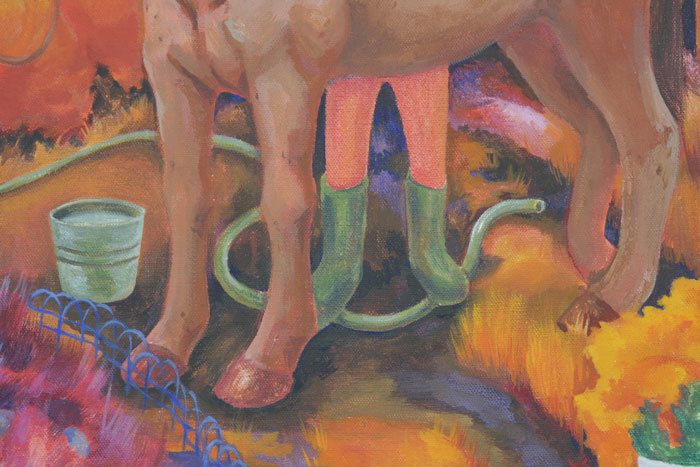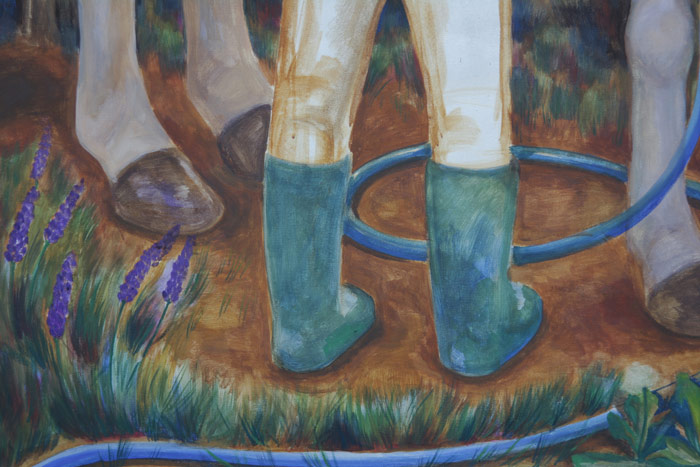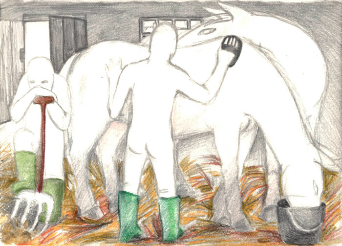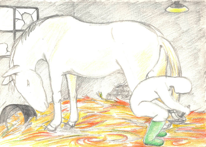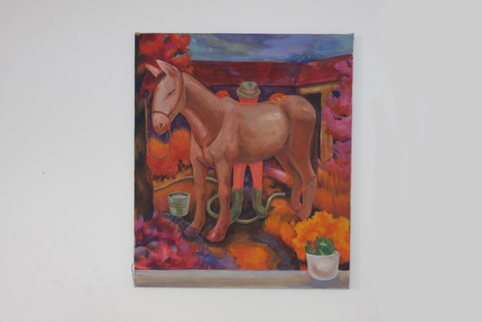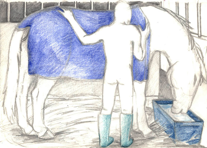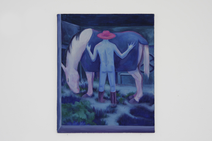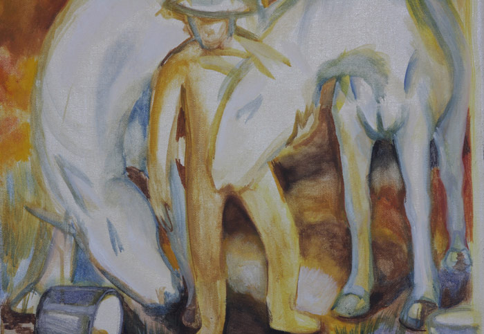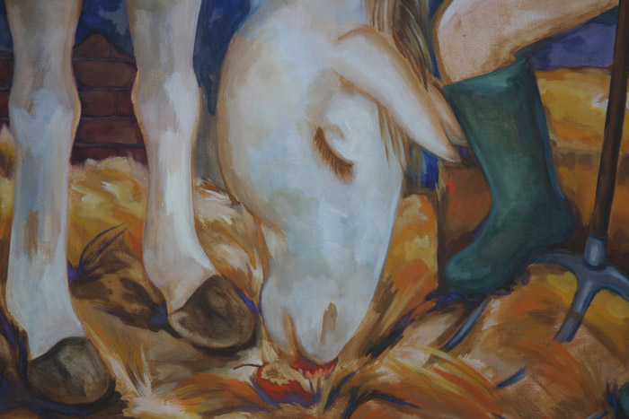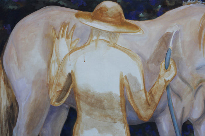 In my bachelor's thesis, I further develop the possibilities of depicting emotions associated with contact with horses and a common interspecies understanding, which is something that continues to fascinate me. Hard-to-express connection with a horse, with whom we cannot communicate very successfully verbally or with gestures, and yet it can succeed that the horse is able to do exactly what we want, even before we want it. It is possible that despite the communication barrier we understand each other. This mutual understanding is preceded by the time we spend with the horse other than letting ourselves ride on its back. It is these moments associated with the care of horses that I try to capture in my paintings.
