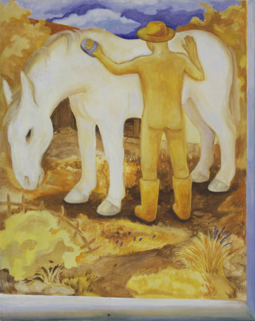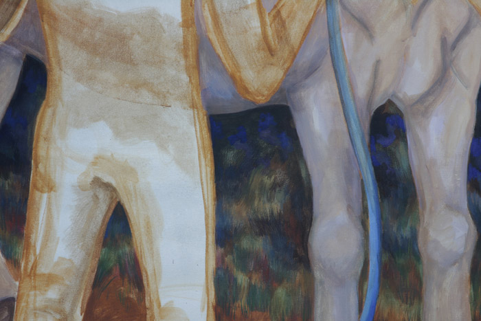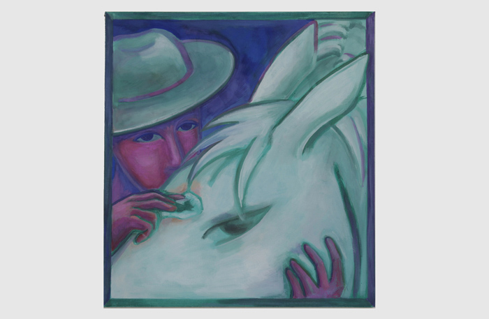 A series of tempera paintings on canvas called "Oppression" is my bachelor's thesis at the Faculty of Fine Arts in Brno. Perhaps surprisingly, realized paintings are not aimed to any depiction of oppression, but are a possible way out of the oppressive impressions and compositions present in my previous paintings. The dominant motive in the paintings is the horse and the central theme of the works is contact with horses and its sensitive and emotional impact on humans. The purpose of the work is to capture my own feelings related to spending time with horses and transfer them reliably on the painter's canvas.