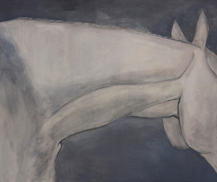 The title “Return to Simplicity” denote a series of monochromatic paintings, various segments of bodies of horses, which arose in between the years 2019 and 2020. Paintings were not created as an answer on comprehensive and in advance invented concept, but as a gradual process in terms of different variations of the topic, which resulted into the form of monochromatic paintings.