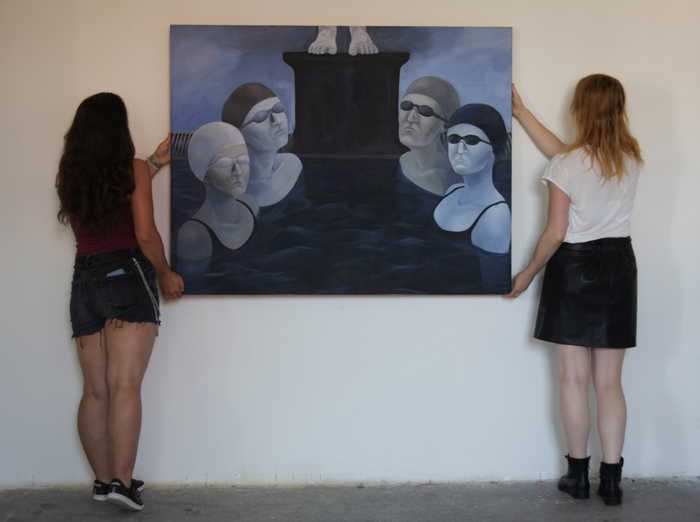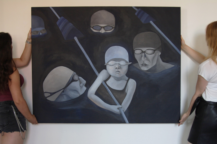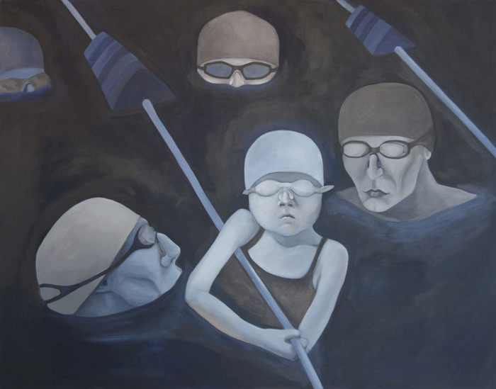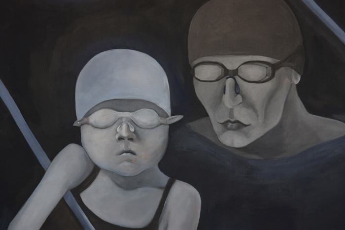 Fundamental became asexual swimmers, deprived from senses due to usage of dark glasses, ear plugs and nose clip. I perceived the swimmers as medium to spread emotions in the paintings. They are creations on the edge of existence, their situation does not offer chance for betterment. They are imprisoned in never ending cycle of agony, in which they take a part. The swimmers share with us, viewers, the suffering from contemporary events.
