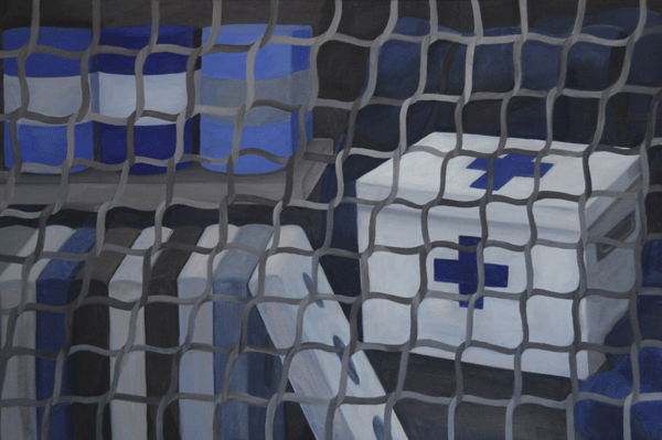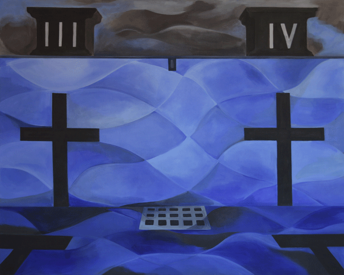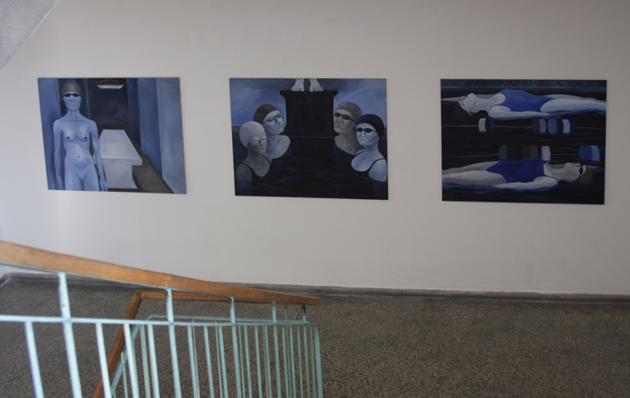 For the purpose to attain coveted effect were used visual metaphors, resemblances between the springboard and grave, delineating lines in pool and crosses at cemetery or the similarity between the changing room and dissecting room. In the paintings itself became significant for me a usage of modest colours. The applicated colours allow me to work with scale of hues and they are not resembling with black and white photographs. The smooth brushstrokes, used in all the paintings, is necessity for me, because I perceive them as not attracting attention which belongs to theme.