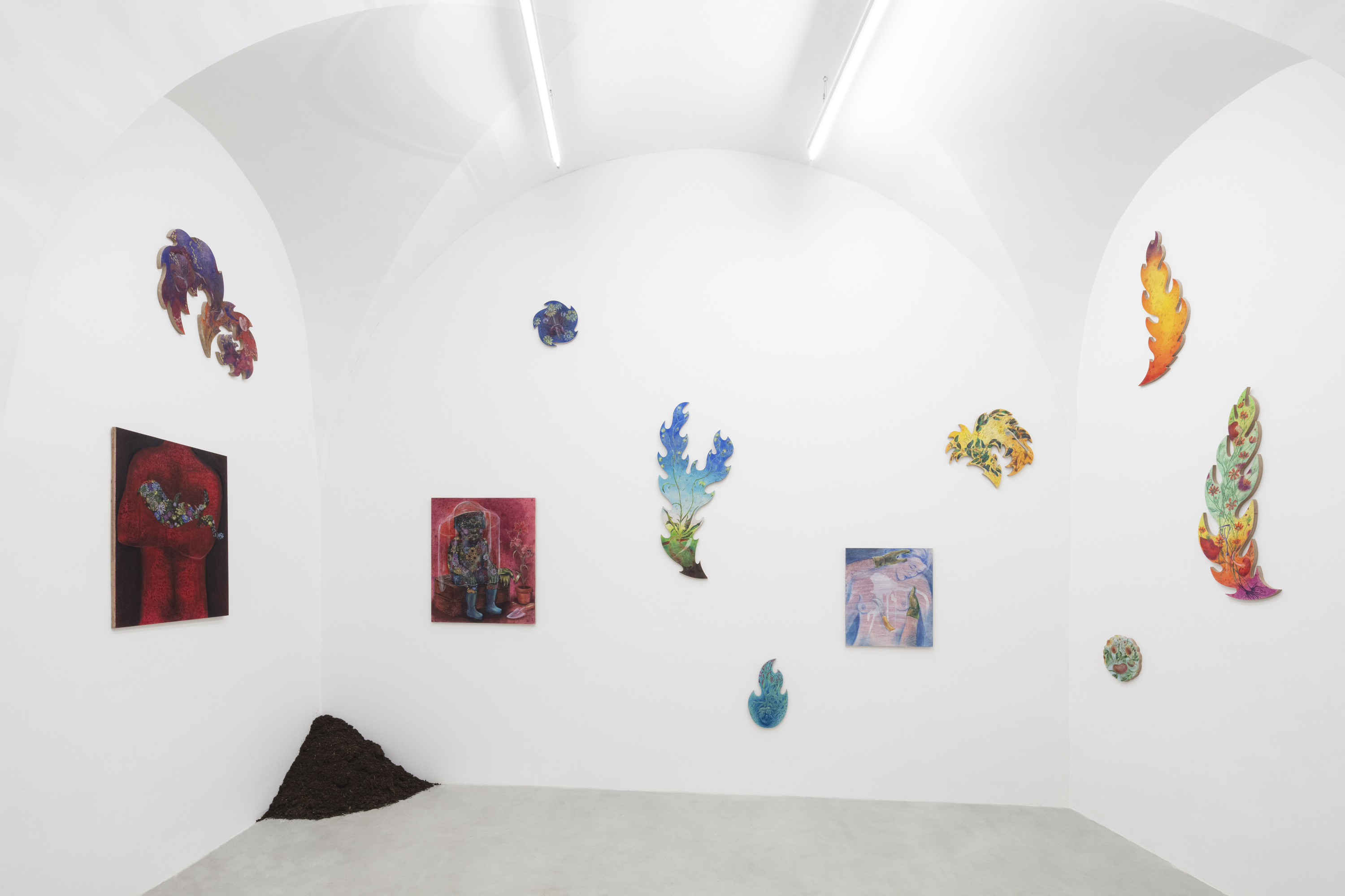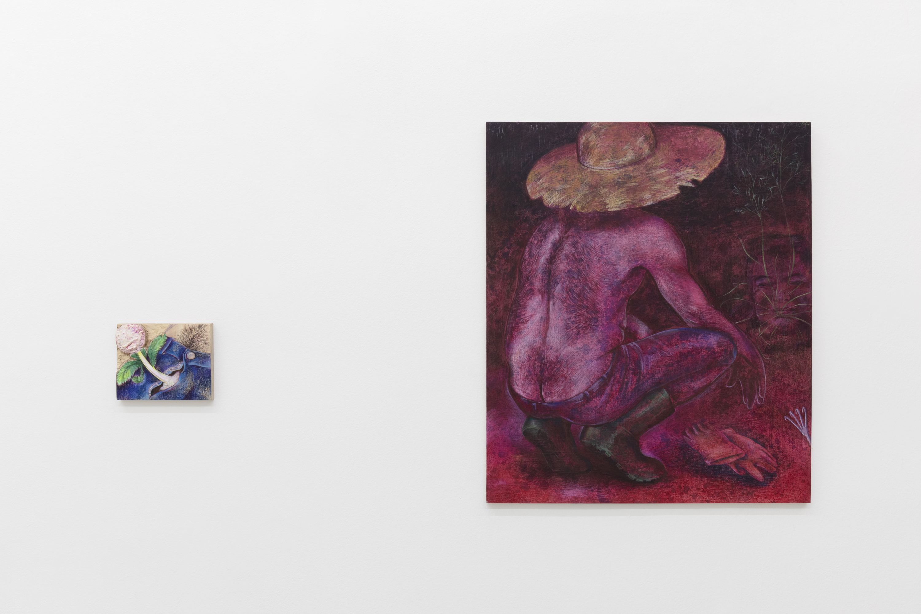 The origin of the human bodies that the Weed Spreader plants is unknown. He may be a murderer, perhaps a collector or a savior, but he is certainly also a caregiving figure. He raises a child who, although having human outlines, likely has bodily tissue that is more plant-like. The paintings in this series do not have the ambition to close the plot or reach a punchline. They observe, immerse, overturn, doubt, try, and above all refuse to stagnate, ossify, or schematize.